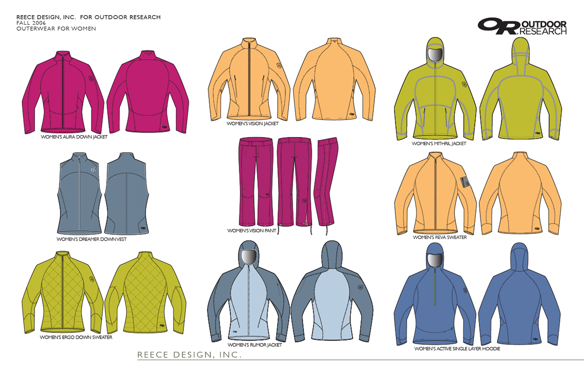 I was honored to work with the fine team at Outdoor Research for over ten seasons designing exceptional and award-winning outerwear, base layer and lifestyle product for a range of mountain pursuits for men and women.  I was responsible for the creation and presentation of all of my designs to the company at different points in the development process.